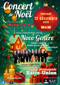 L’ensemble vocal mosellan Novo Genere, dirigé par Jacky Locks, donnera un grand concert de Noël le samedi 13 décembre 2025 à 18h30 à l’église protestante de Sarre-Union.