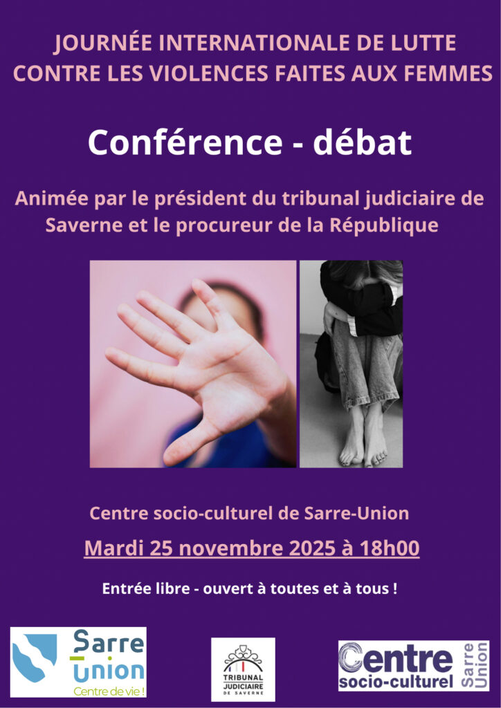 Parce que les violences ne sont pas une fatalité, parce que personne ne doit subir en silence, nous vous invitons à venir nombreux et nombreuses le mardi 25 novembre 2025 au centre socio-culturel de SARRE-UNION à 18h00 pour vous informer, comprendre et agir afin de soutenir toutes les femmes qui subissent des violences.