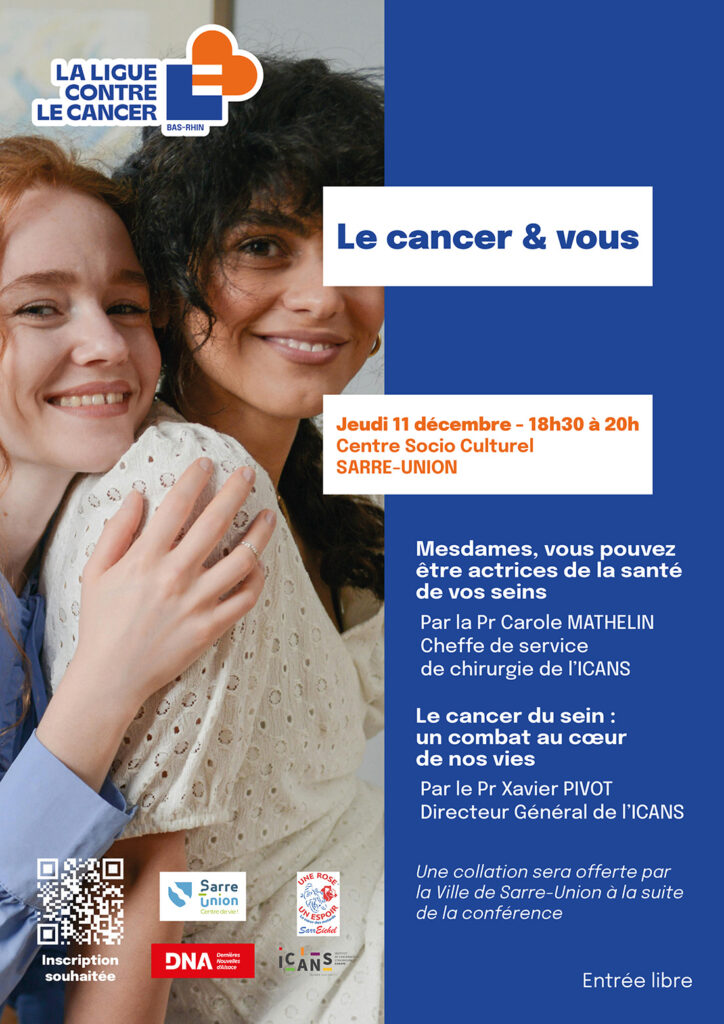 La Ligue contre le cancer du Bas-Rhin, en partenariat avec la Ville de Sarre-Union, vous invite à une conférence autour du cancer du sein, le jeudi 11 décembre de 18h30 à 20h au Centre Socio-Culturel de Sarre-Union.
