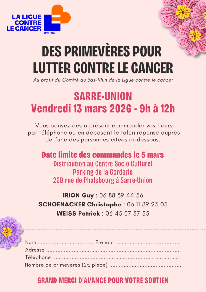 Commandez dès à présent vos fleurs par téléphone avant le 5 mars 2026 et récupérez-les le vendredi 13 mars 2026 de 9h à 12h à l’Espace Ligue, situé au Centre socio-culturel (parking de la Corderie), 26B rue de Phalsbourg à Sarre-Union.