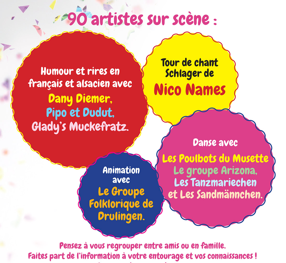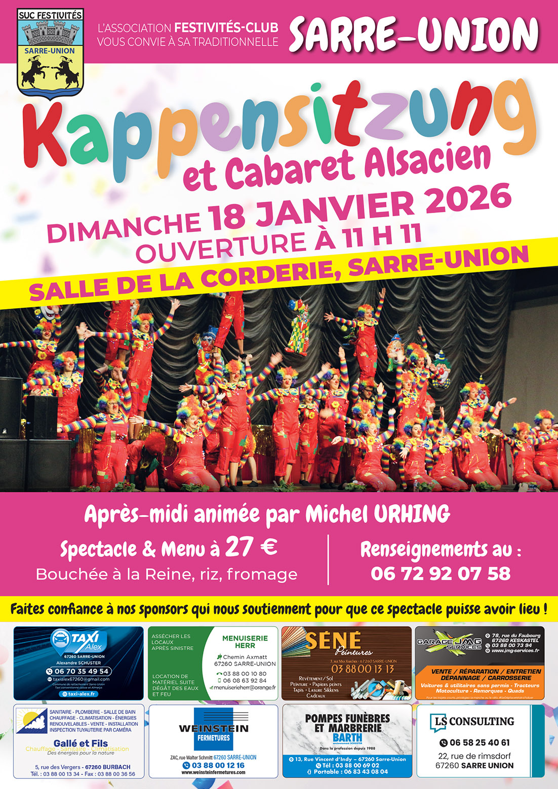 L’association Festivités Club organise le dimanche 18 Janvier 2026 sa traditionnelle Kappensitzung avec Cabaret alsacien animée par Michel Uhring à la salle de la Corderie de Sarre-Union à partir de 11 Heures 11.